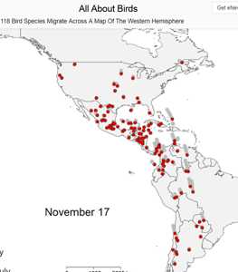We couldn’t resist this terrific piece of info on migration from Cornell Lab of Ornithology. Using millions of pieces of data from ebird combined with other sources, they put together an animated map of 118 species of birds and their movements including migration, throughout one year. It’s fascinating to see that some of the birds who go the furthest south are the fastest migrators and breed the furthest north. Check out the migratory paths of these birds and watch the show! Want to know which birds are which? Here’s the key. |